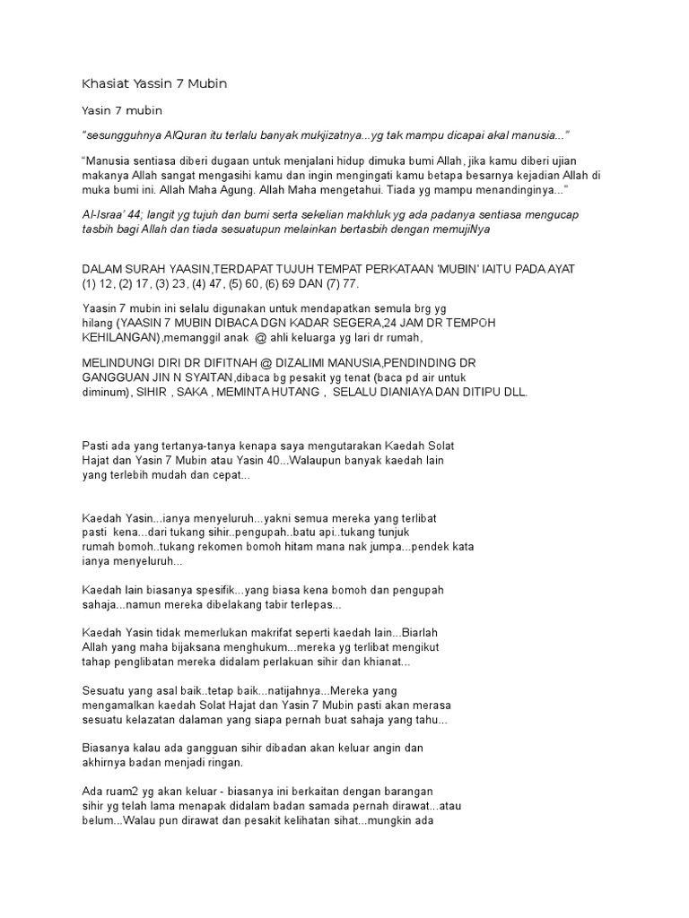 Mubin duası yasin suresi ile beraber okunan etkili bir duadır. Barang dalam hal ini perlulah barang yang berharga seperti anak, kenderaan. Kembalikan sihir kepada penyihir/yasin 7 mubin: Download lagu yasin 7 mubin kembalikan sihir mp3 dapat kamu download secara gratis di lagu. Berdoa mubin pertama memohon apa hajat kemudian terus baca yang seterusnya